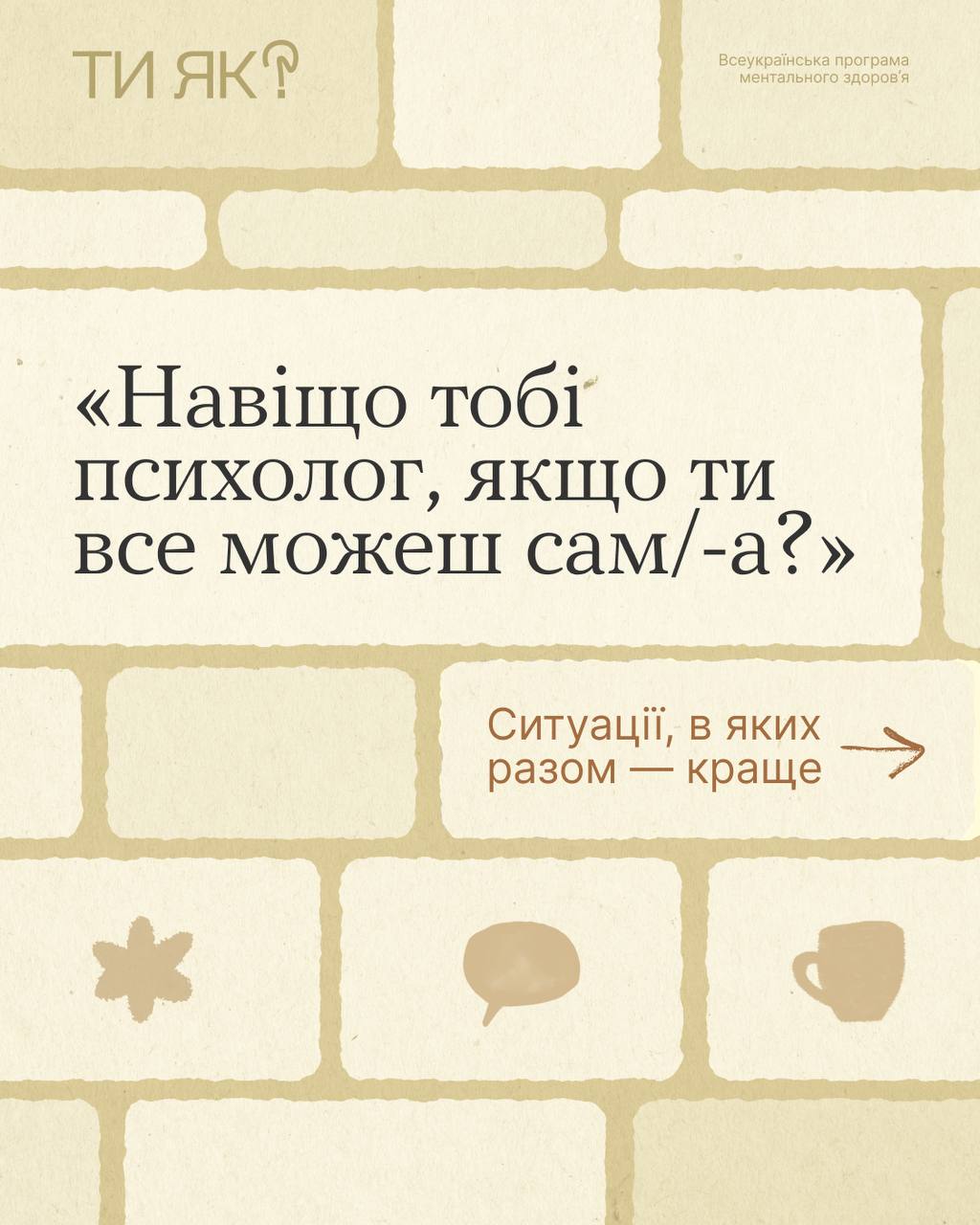 Але психолог буде поруч і підтримає: коли ти зайдеш у глухий кут, слова афірмацій перестануть діяти, а всі книжки із саморозвитку будуть прочитані. Коли ти зірвешся і повернешся до шкідливої звички чи повториться неприємна ситуація з минулого. Коли ти виснажишся або тобі здаватиметься, що твої цінності несправжні… Ні, психолог не зробить за тебе усю роботу, а його слова можуть підштовхнути до роздумів про те, чого ти раніше не помічав/-ла. Це може не завжди приємно, але часто — ефективно 😉