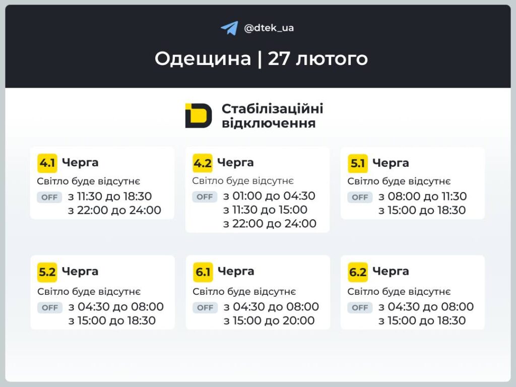 ‼️Одещина: графіки відключень на 27 лютого