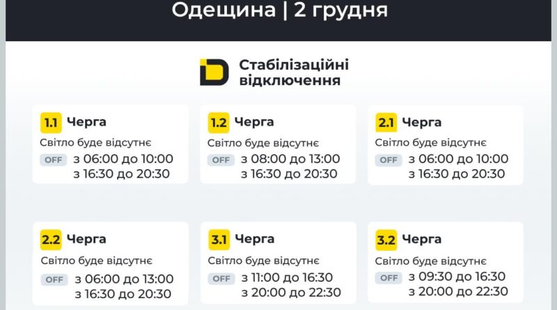 ‼️Одещина: оновлені графіки відключень на 2 грудня