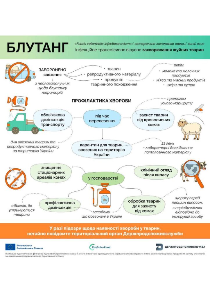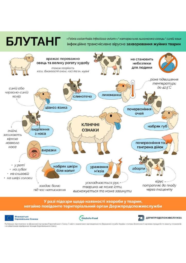 Блутанг (катаральна лихоманка овець/ синій язик) – інфекційне трансмісивне вірусне захворювання жуйних тварин (вівці, кози, велика рогата худоба, білохвості олені, буйволи, антилопи, лосі та інші жуйні). Для людини небезпеку не становить. Зараження поширюється лише через укуси комах роду Culicoides, вірус довго знаходиться у крові. Перебіг хвороби можливий з проявом ознак (інкубаційний період 5-20 днів) або без них (симптоми відсутні або малопомітні).
