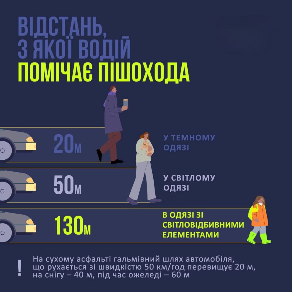 🔸обов’язково використовувати світловідбивні елементи — флікери (вони збільшують видимість пішохода в кілька разів); вішати їх на сумки, рюкзаки, одяг (бажано – на висоті стегна);