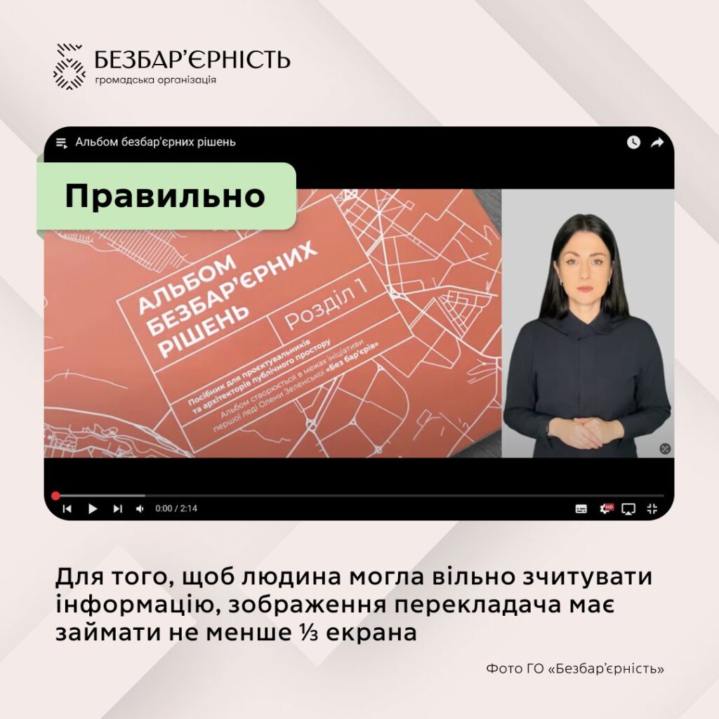 Схожа ситуація і з перекладом жестовою мовою у відео. Коли перекладача чи перекладачку розміщують у маленькому віконці без належного масштабу та чіткості – це робить переклад фактично непридатним для сприйняття. Доступність інформації не забезпечується самим фактом присутності перекладу, вона визначається якістю його реалізації. Для того, щоб людина могла вільно зчитувати інформацію, зображення перекладача має займати не менше ⅓ екрана.