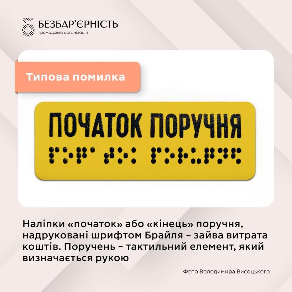 Ще один показовий приклад – наліпки «початок поручня», «поручень продовжується» та «кінець поручня» із дублюванням тексту шрифтом Брайля. Очікується, що вони будуть корисними для людей із порушеннями зору. Однак поручень є тактильним елементом за своєю природою. Людина визначає його початок і завершення рукою, а не очима. До того ж доволі часто такі наліпки містять помилки, а шрифт Брайля є пласким – і це унеможливлює зчитування на дотик.