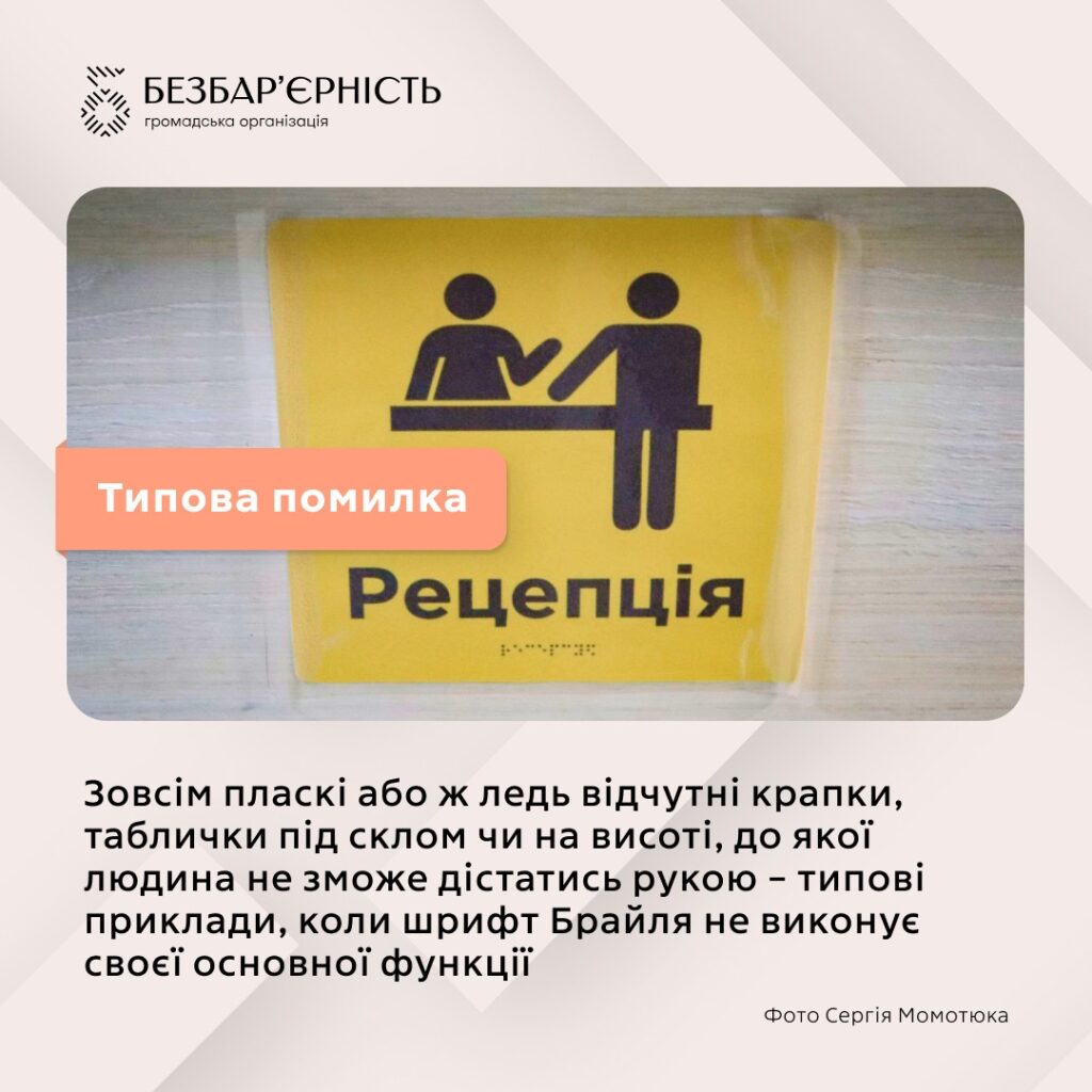 Загалом у дублюванні інформації шрифтом Брайля формальний підхід проявляється дуже часто. Зовсім пласкі або ж ледь відчутні крапки, таблички під склом чи на висоті, до якої людина не зможе дістатись рукою – це типові ситуації, коли не виконується основна функція. Детальніше про вимоги до шрифту Брайля ми вже писали тут –