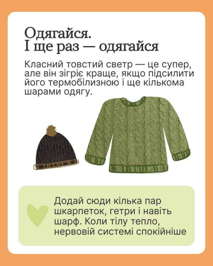 Використовуй усі доступні, але безпечні способи зробити собі тепліше. Та поділися своїми з іншими в коментарях ![]()