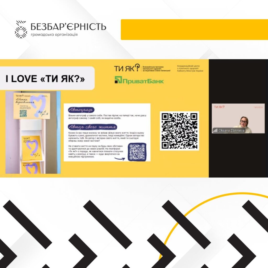 «Бізнеси спільноти – невід’ємна частина екосистеми Всеукраїнської програми ментального здоров’я Ти як? – ініціативи першої леді Олена Зеленська. Це і про навчання, і про ментальне здоров’я у корпоративних політиках, і психологи, які працюють в компаніях», – наголосила Оксана Збітнєва, керівниця Координаційного центру з психічного здоров’я КМУ, голова ГО «Безбар’єрність».