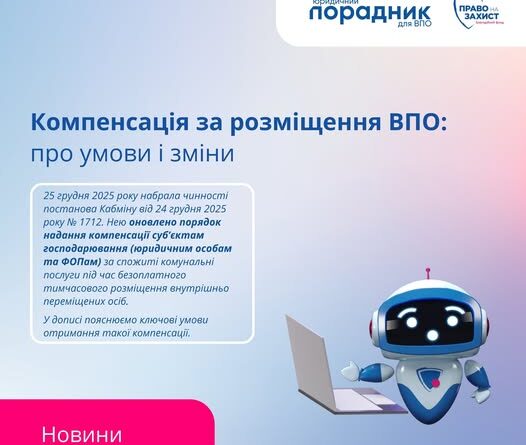 Держава постійно піклується проблемами забезпечення житлових прав внутрішньо переміщених осіб (далі — ВПО). 25 грудня 2025 року набрала чинності постанова КМУ від 24 грудня 2025 року № 1712, якою оновлено Порядок надання компенсації суб’єктам господарювання (зверніть увагу, що йдеться не про приватних осіб, для яких діє окремий порядок компенсації, а саме про юридичних осіб та ФОПів) за спожиті комунальні послуги під час безоплатного тимчасового розміщення ВПО.