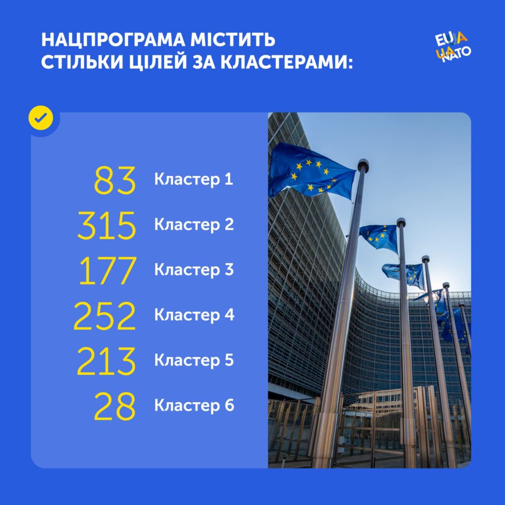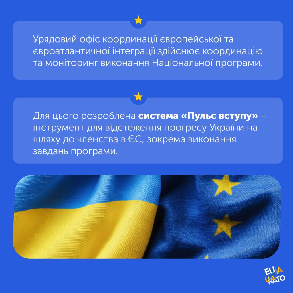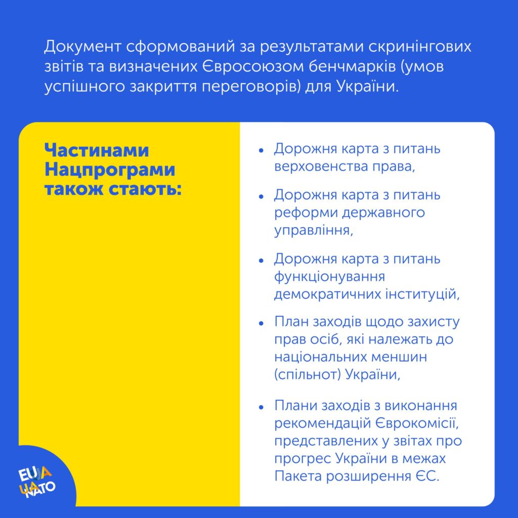 У рубриці #Процес_вступу_до_ЄС пояснюємо ключове про цей стратегічний документ, який визначає всі необхідні кроки на шляху до членства в Євросоюзі для приведення українського законодавства та інституцій у відповідність до норм ЄС.