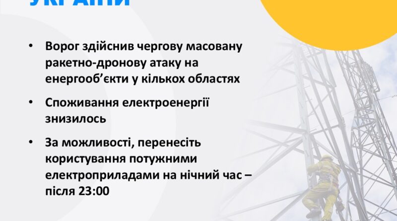 Вночі та вранці ворог здійснив чергову масовану ракетно-дронову атаку на енергооб’єкти у кількох регіонах України. Внаслідок цього – на ранок є значна кількість знеструмлених споживачів на Одещині (зокрема – у м. Одеса). Також через російські удари є знеструмлені споживачі у Запорізькій, Донецькій, Дніпропетровській та Харківській областях. Скрізь, де це дозволяє безпекова ситуація, вже почались аварійно-відновлювальні роботи. Енергетики роблять усе можливе, щоб якнайшвидше повернути пошкоджене ворогом обладнання в роботу.