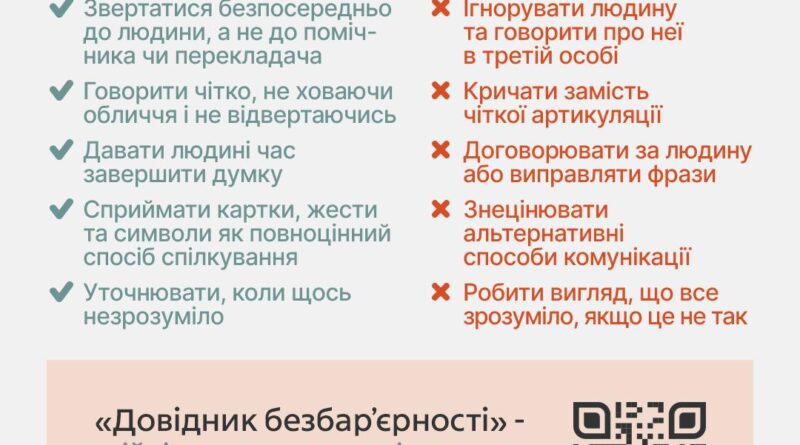 Важливо будувати взаємодію так, щоб співрозмовники відчували повагу, увагу та безпеку, а не поспіх або роздратування. Про етику взаємодії з людьми, які користуються альтернативними засобами комунікації, йдеться в оновленому розділі «Довідника безбар’єрності», створеному в межах ініціативи першої леді Олена Зеленська. Ось кілька порад від експертів Звертайтеся безпосередньо до людини. Навіть якщо поруч є помічник або перекладач жестової мови, важливо говорити саме з людиною, а не про неї. Це підкреслює рівність у спілкуванні. Підлаштовуйтеся до способу комунікації, а не навпаки. Деякі люди можуть читати по губах, інші – сприймають інформацію через[…Читати далі…]
