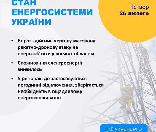 Споживання електроенергії відповідає сезонним показникам Необхідність в ощадливому енергоспоживанні зберігається За можливості, перенесіть користування потужними електроприладами на нічні години – після 23:00 НАСЛІДКИ ОБСТРІЛІВ Внаслідок ворожих ударів по енергетичній інфраструктурі – на ранок є знеструмлені споживачі у Харківській, Чернігівській, Сумській, Донецькій, Дніпропетровській і Запорізькій областях. Там, де це наразі дозволяють безпекові умови, вже здійснюються аварійно-відновлювальні роботи. Енергетики роблять усе можливе, щоб якнайшвидше повернути в роботу пошкоджене ворогом обладнання та заживити усіх знеструмлених абонентів. Через наслідки попередніх масованих російських атак – у більшості регіонів України сьогодні застосовуються графіки обмеження потужності для[…Читати далі…]