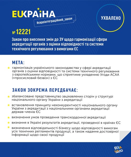 Сьогодні Верховна Рада України ухвалила в цілому закон реєст. №12221, який є необхідним на шляху до укладання Угоди АСАА з ЄС – «промислового безвізу».