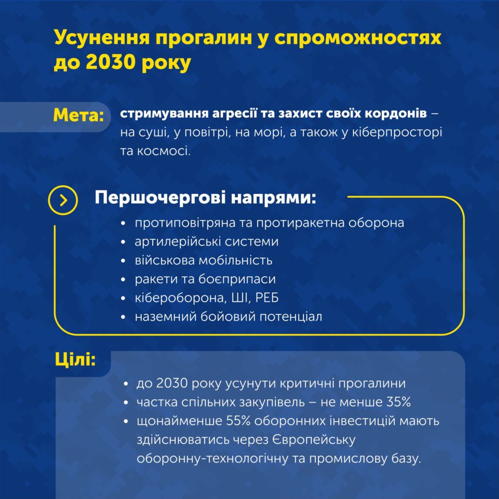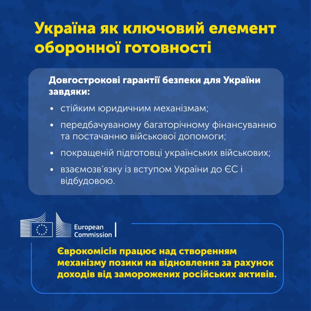 Україна залишається першою лінією оборони Європи та невід’ємною частиною її безпекової архітектури – про це йдеться у презентованій ЄС «Дорожній карті оборонної готовності до 2030 року»