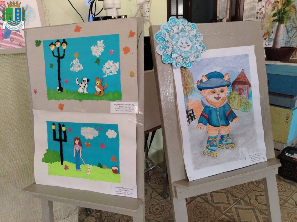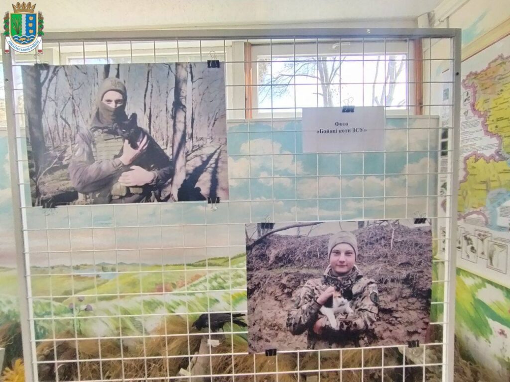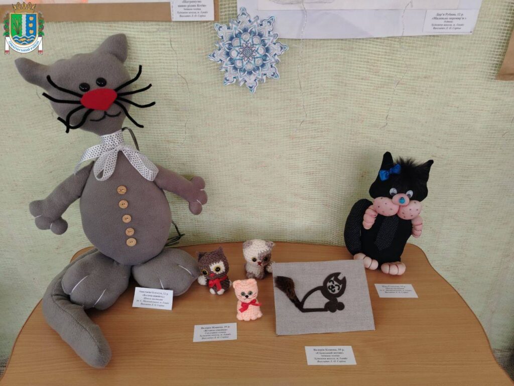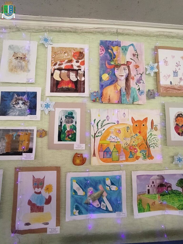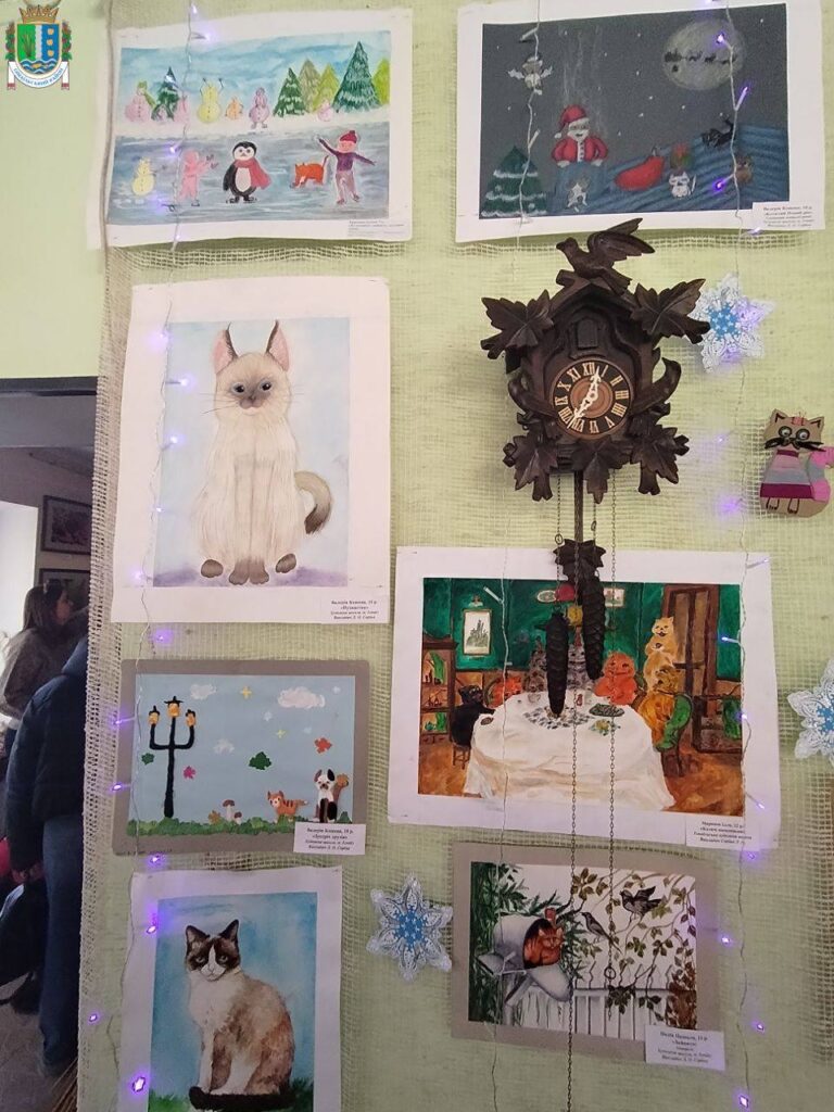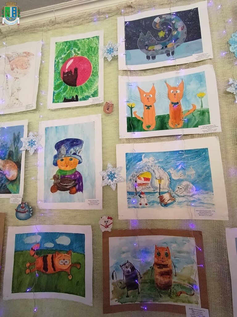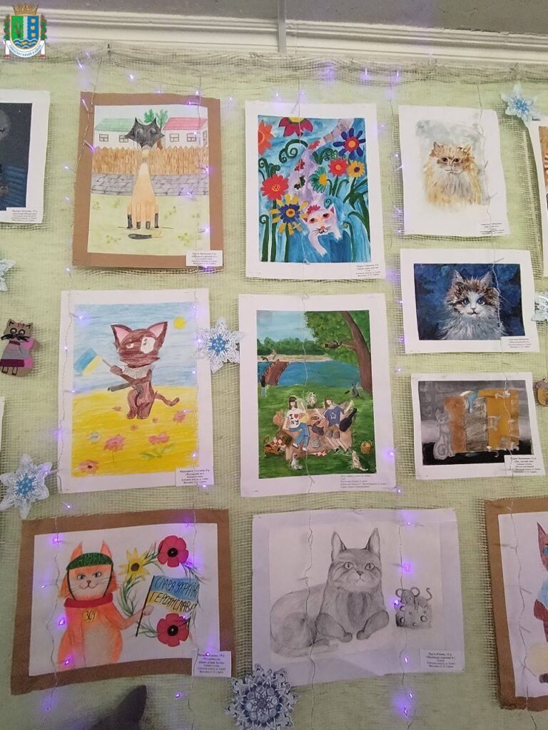 Перша – це малюнки дітей різного віку, які присвячені котячим витівкам, спогадам і надіям учнів про мир і мирне життя. Представлено понад 50 робіт учнів, виконаних у різних техніках: гуашшю, сухою пастеллю, олівцями та аквареллю. Кожна робота є яскравим свідченням творчої фантазії, невичерпної терпеливості та майстерності, що народжуються в умілих руках учнів.
