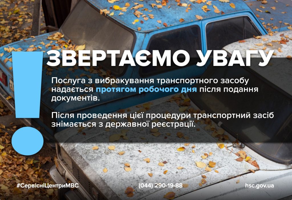 Транспортні засоби, які більше не придатні до використання через пошкодження, зношення або інші обставини, можуть бути зняті з державної реєстрації або тимчасового державного обліку шляхом вибракування. Така послуга надається у будь-якому сервісному центрі МВС та є безоплатною.