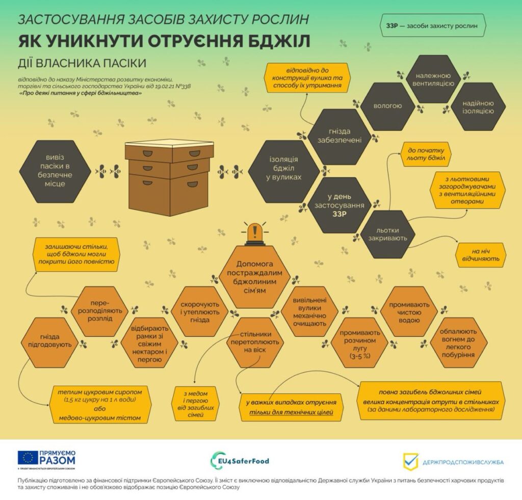 Інструкцією з профілактики та встановлення факту отруєння бджіл засобами захисту рослин, затвердженою Наказом Міністерства розвитку економіки, торгівлі та сільського господарства України 19.02.2021 № 338, встановлено необхідні заходи профілактики отруєння бджіл та механізм взаємодії власників пасік, фермерів та органів місцевого самоврядування.